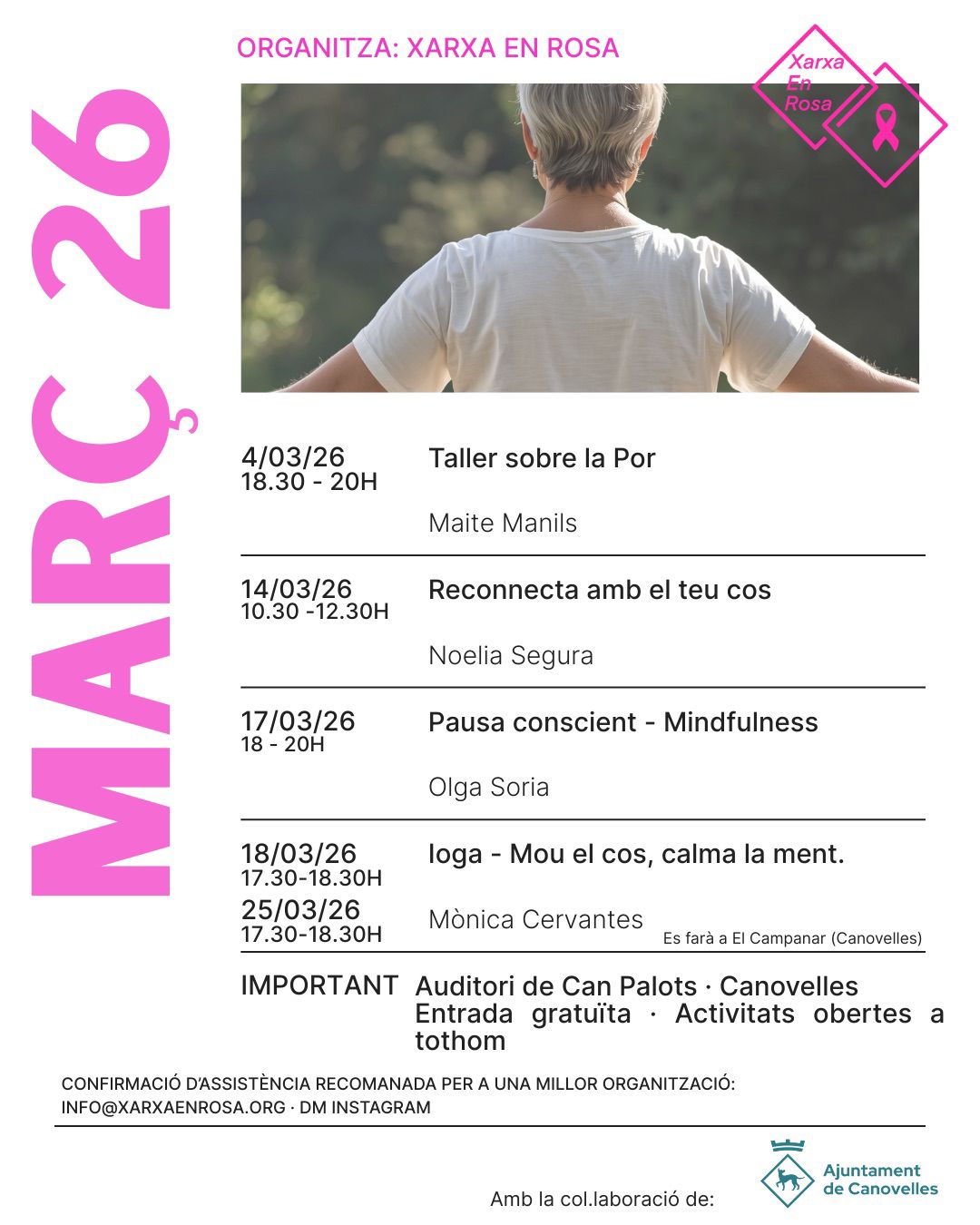 Con este programa mensual, Xarxa en Rosa sigue impulsando actividades gratuitas de bienestar en Canovelles, abiertas a todas las personas interesadas en cuidar su salud física y emocional y compartir espacios de encuentro con la comunidad.